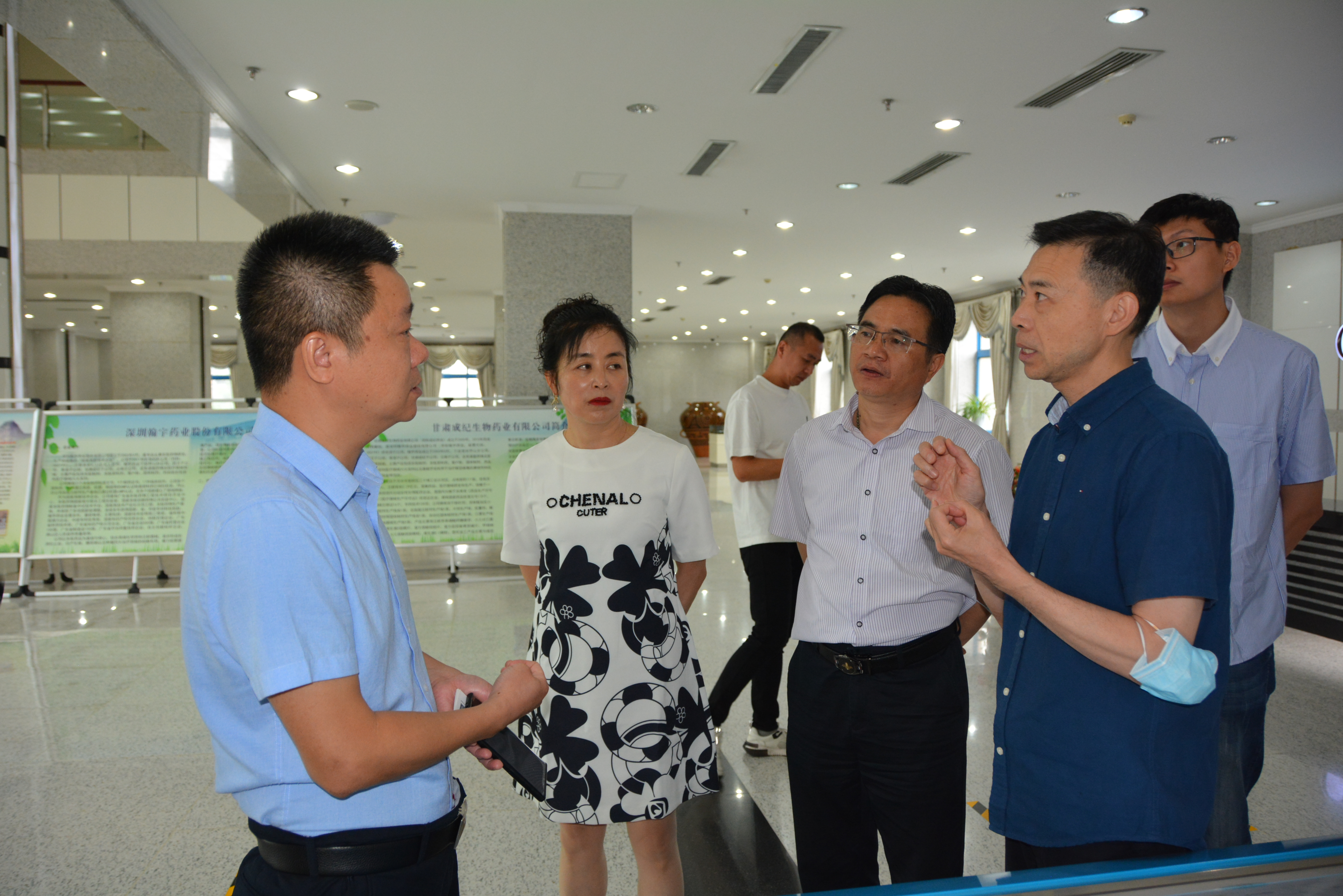 8月19日上午甘肃信谊天森药业有限公司董事长孙忠达、总经理唐剑平等领导一行在天水开发区管委会副主任李俊文的陪同下来成纪药业参观交流。